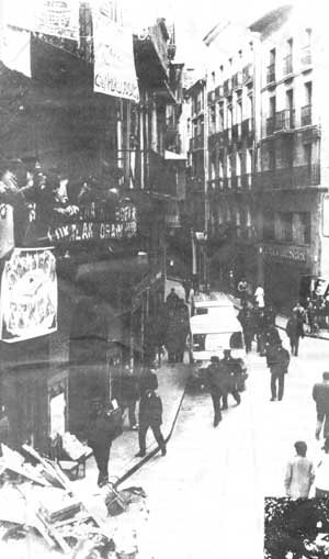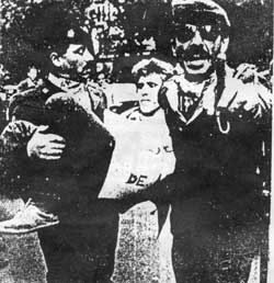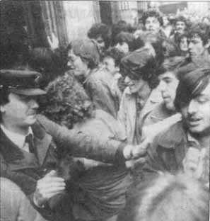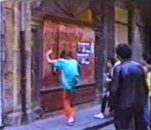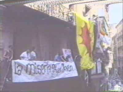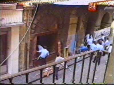 | Al rato aparece un nutrido grupo de P.M. pidiendo el desalojo de la casa; media hora mas tarde llega la P.N. que "despeja" la zona. La P.M. penetra en el edificio y desaloja un@ a un@ a l@s jovenes, por su propio pie o en volandas. Despues de varias cargas, la P.N. se retira de la zona. Un reten de la P.N. se queda en la puerta de la cas impidiendo una nueva okupacion. |